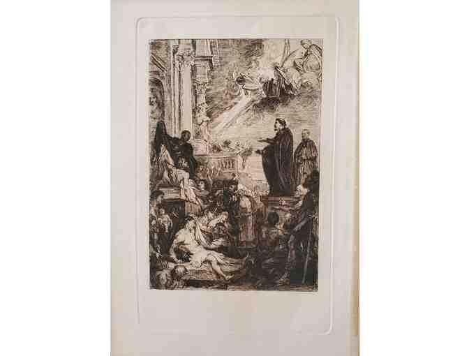 Etching by William Unger. Titled St. Francis Xavier Raising the Dead. Title and etcher information on the reverse