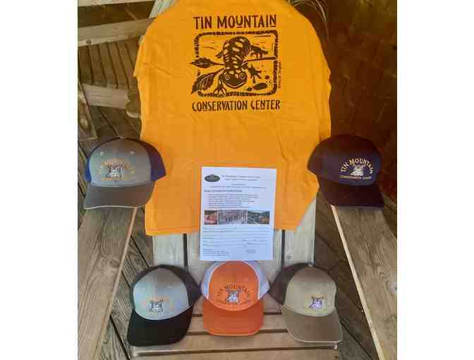This Tin Mountain Conservation Center Annual Membership comes with swag! You will receive a spotted salamander woodcut T-Shirt (available in sizes youth xs - adult xl), your choice of 5 Hat colors, and one of each TMCC stickers (spotted salamander, barred owl and hermit thrush).