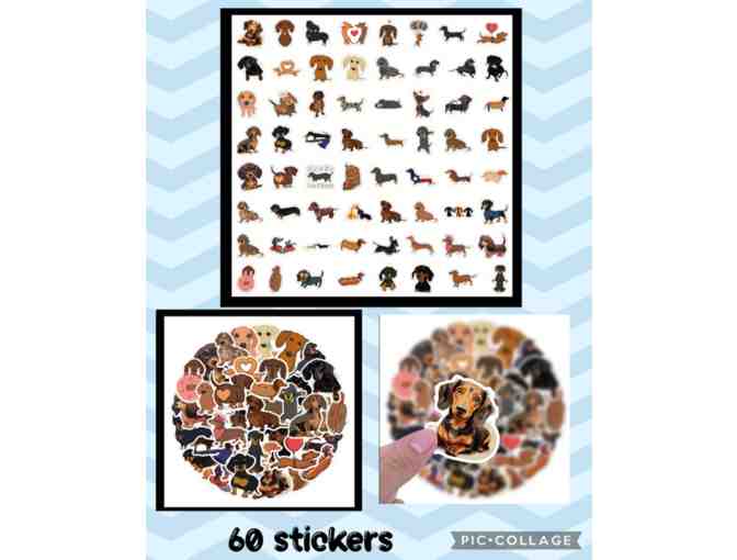60 unique dachshund stickers! Each sticker is approx 2" tall by 2" wide. No repeats!