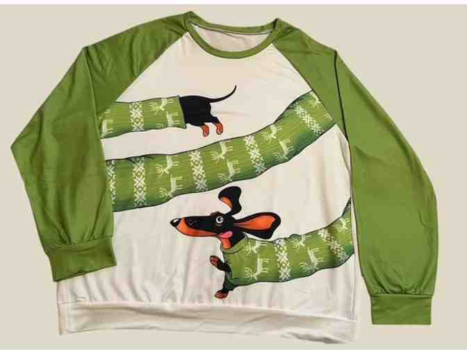 SUPER fun dachshund shirt!! Size Large. It measures 23" across under the arms and 25" down the back. It is 95% Polyester and 5% Elastane. The back is white; there is no design.