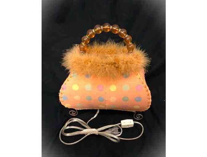 Unique and fun - Vintage 1980's "Purse Lamp" - Brand new, tags still on, LIGHTS UP - never used!  Very pretty "Purse Light" - made of satin fabric with fluffy feathers around the top.  Also features a 1950's-style plastic beaded handle and feet.  Festive ORANGE color with fun polka dots.  Size is 9" long by 4.75" wide by 11" tall (to top of handle).   Tested - and it works!  Available for shipping nationwide (with insurance) - or Winning Bidder may pick up for FREE in Enfield, CT after the Auction.