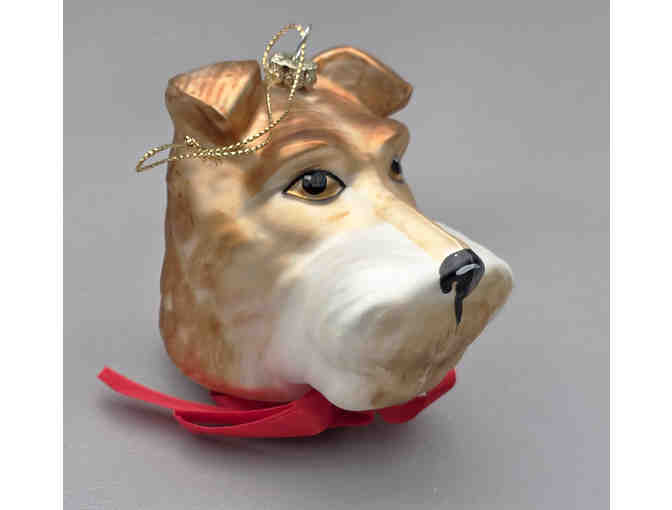 Painted glass Airedale head ornament. 3" tall x 3.5" long not including hanger.
