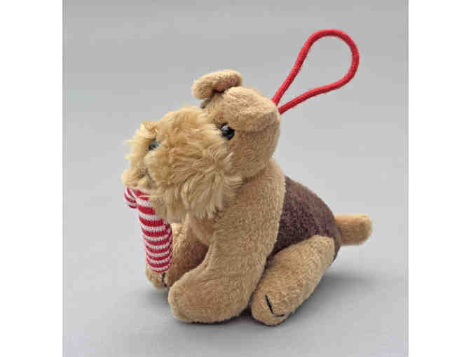 Plush Airedale Ornament with a Candy Cane in its Mouth