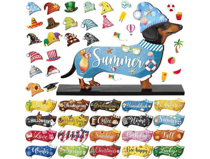 You'll receive one wooden dachshund, one wooden based and 20 sets of assorted interchangeable holiday hats and coats (40 in total). He isn't huge but perfect for your office or living area decor. He is 7.5 x 4.4". It uses magents for his outfits.
