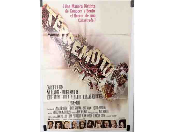 Earthquake, the 1974 Mark Robson disaster thriller starring Charlton Heston, Ava Gardner, Lorne Greene, George Kennedy, Genevieve Bujold, Richard Roundtree, Marjoe Gortner, Barry Sullivan, Lloyd Nolan and Victoria Principal.