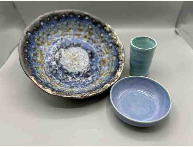 This handcrafted ceramic set is a celebration of natural color, texture, and form. It includes a large bowl with a mesmerizing swirl of deep blue, earthy brown, and celestial white glaze; a soft lavender-toned side bowl; and a tall, turquoise-toned tumbler- each one a unique work of art.