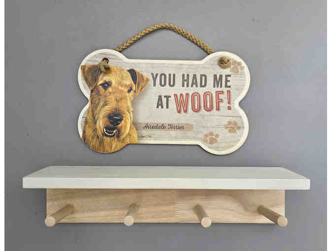 Leash station includes bone sign "You had me at Woof!" with Airedale, 5.5" x 9.5" not includng the rope hangar paired with wood leash rack, 13" wide