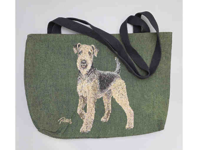 Tapestry Airedale tote bag, lined. 17" wide x 12" tall not counting handles. Airedale design on both sides of tote.