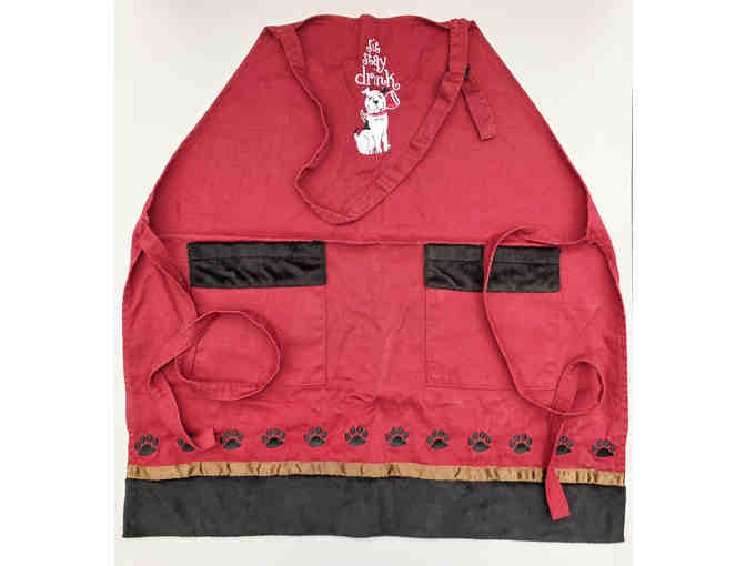 Red and black full body apron with embroidered generic dog and pawprints that says "Sit, Stay, Drink" Adjustable neck strap plus straps to tie behind.