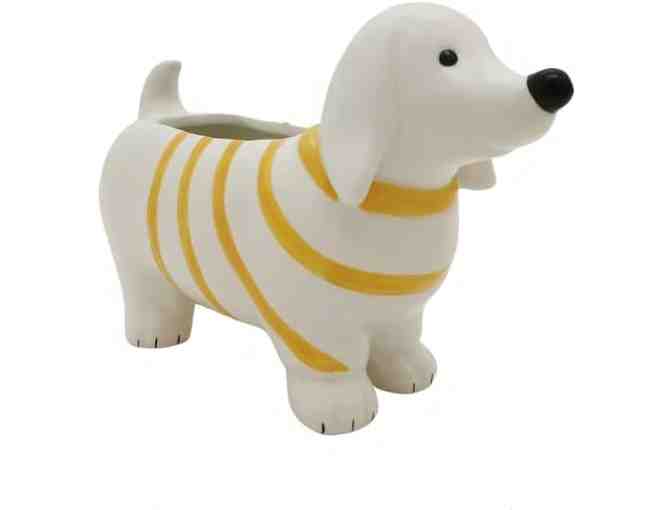 Fun ceramic dachshund planter.  Ideal planter for mini succulents, herbs, cactuses, and artificial plants.  It has a hole in the bottom with a plastic stopper. I have included a photo with a succulent but it is not included with the planter.