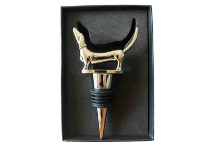 Attractive stopper fits standard wine, liquor and oil bottles. Made of metal and rubber. Approximately 2.5" x 4.25". Beautifully gift boxed.
