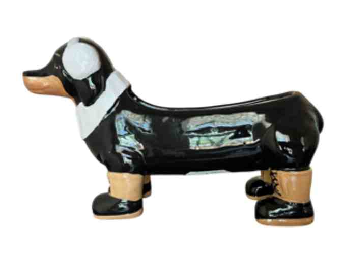 Brand new condition!! It may have been on display but it is PERFECT! You will love this pup in his ear muffs and winter boots. 10.5" long x 6.5" high. Light pine scented candle.