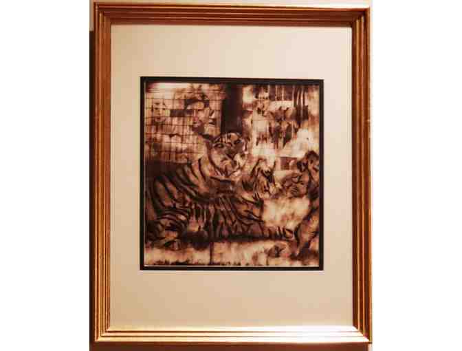 This sketch art, pencil and charcoal drawing is a resplendent example of a difficult-to-master visual art. In sepia tones in a beautiful gold frame with a wide, double mat, this image of tigers turning away from the gawking spectators is spectaculary accomplished.