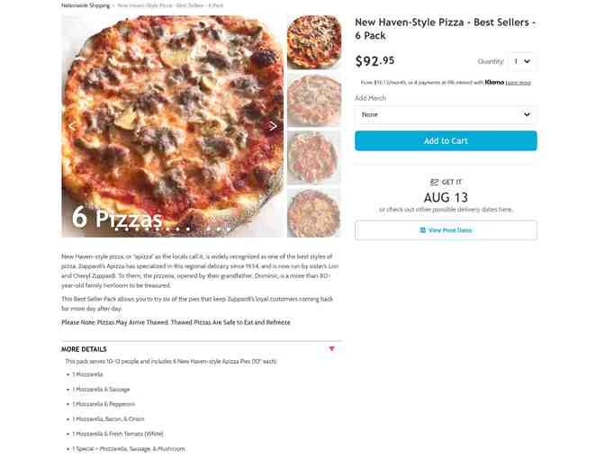 This pack from Zuppardi's Apizza serves 10-12 people and includes 6 New Haven-style Apizza Pies (10"" each)
