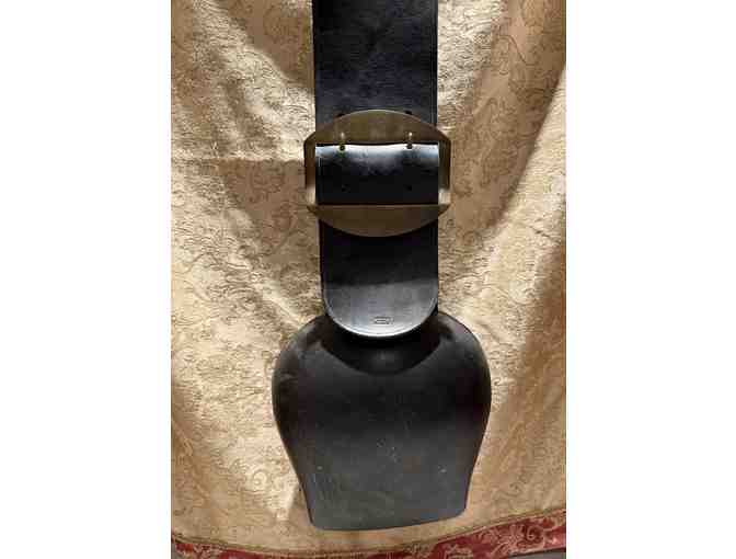 This is a very large Swiss Cow Bell with original black leather strap. This bell is a unique and traditional piece that would make a wonderful addition to any antique or primitive collection. With its historical significance and craftsmanship, this cow bell captures the essence of Swiss heritage and culture.