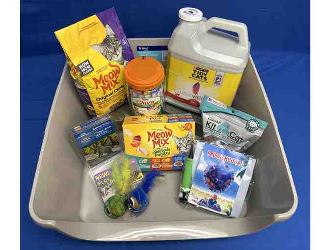 Pamper your feline friend with this purr-fectly packed cat care basket, cleverly presented in a jumbo senior litter box for both style and function! This bundle includes a 50-pack of Churus (because no cat can ever have too many treats!), dry and wet food, a variety of toys to keep playtime exciting, and a leash and harness for the more adventurous kitty. It also comes with litter, a cat health check-up urine sample kit, and all the essentials to keep your cat happy, healthy, and spoiled. Whether you're a new cat parent or a seasoned pro, this basket has everything to keep your whiskered companion purring with joy!