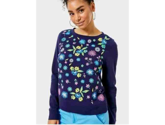 Genuine Lilly Pulitzer sweatshirt/pullover, true navy blue with colorful embroidered flowers. Women's Large (chest measures approx. 21.5"). 100% cotton, handwash in cold water separately, lay flat to dry, can be dry cleaned. Made in India.