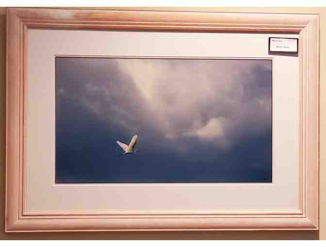 This striking signed photograph captures the elegance of a lone great egret in graceful flight against a dramatic, moody sky. The soft white of the bird’s wings contrasts beautifully with the deep, stormy blues and shifting light of the clouds, creating a sense of both serenity and movement.