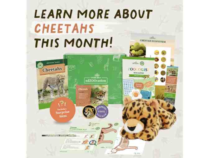 An EdZOOcation conservationist subscription enrichment box that focuses on cheetah conservation. The Conservationist Box for ages 9-12 features a curriculum with STEAM-based activities, fostering critical thinking and conservation efforts.