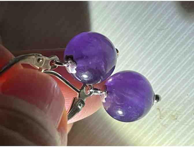 Earrings, 8mm diameter, natural dark purple amethyst. Sterling silver ear wear. Genoursly donated by Jenny Tang
