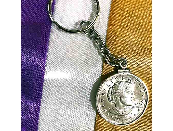 Susan B Anthony Dollar keychain. Designed to honor Susan B. Anthony's 200 Birthday (February 15, 1820) and to celebrate the 100th year of the ratification of the 19th Amendment, granting Women the Right to Vote. (August 26, 1920)