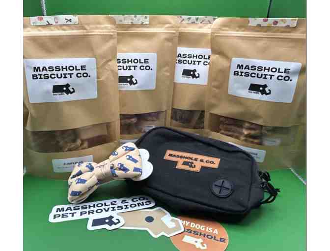 This gift basket includes four of the 7.5 ounce bags including Apple Cheddar, Chicken Broccoli Alfredo, Pumpkin PB, and Beef Stew. Also included are a few Masshole stickers, a Masshole + Co. fanny pack, and a specially made Masshole & Co. bowtie (made by Reunion sponsor Slobber Threads).