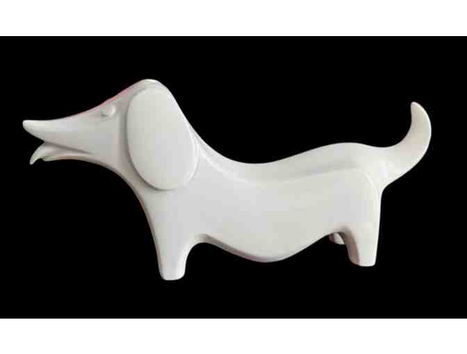 This Jonathan Adler figurine features a charming dachshund design that is perfect for any dog lover. The figurine measures 5.75" in length, 1.5" in width, and 2.5" in height, making it a small and delicate addition to any room. The matte white finish and solid pattern add to the figurine's art deco style, while the 3D effect and indoor features make it a unique and eye-catching piece. This piece is in beautiful condition! Sticker is present on the bottom.