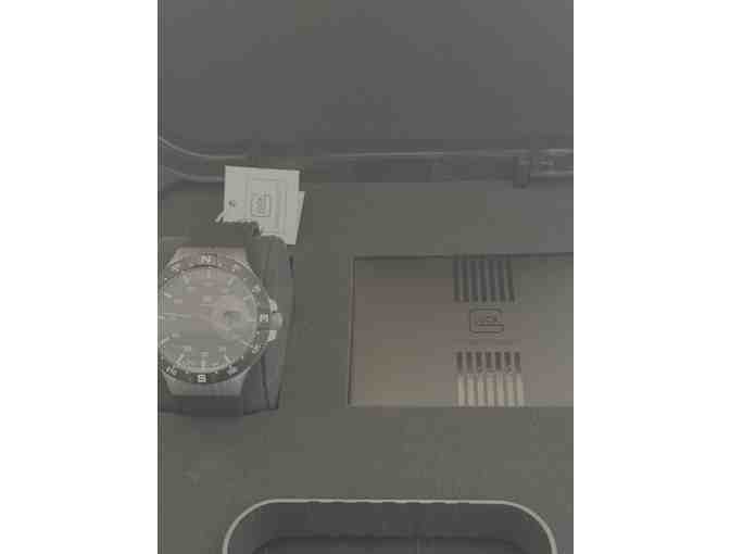 The watch has a swiss movement with a stainless steel black dieal and a black silicone band
