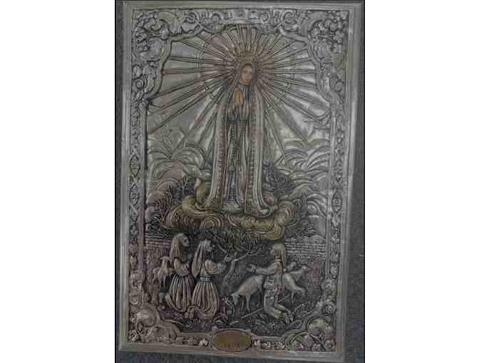 This beautiful devotion to our Blessed Mother of Fatima would make a wonderful addition to any space. Crafted in sterling silver with a convenient hanging loop and accompanied by an acrylic stand, this 8.8" x 13.2" plaque adds reverence to any space.