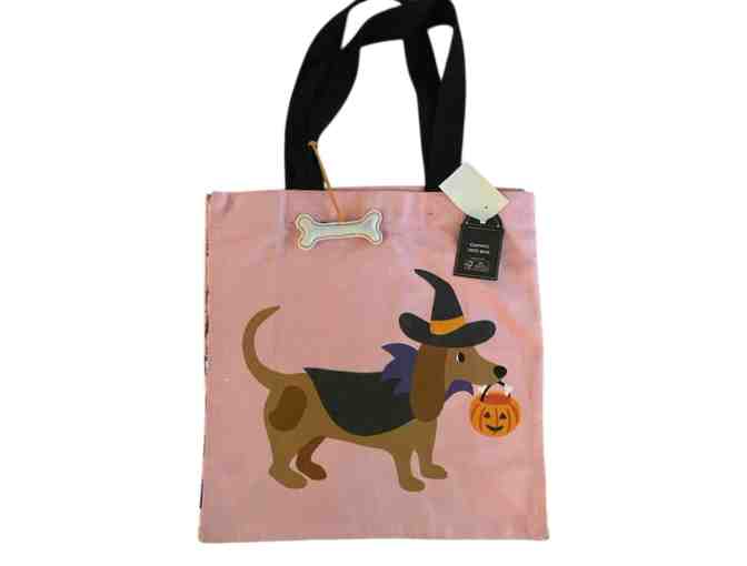NWT Cute canvas tote bag featuring a Dachshund holding a trick or treat pumpkin! 15 1/2 Long 15 1/2 wide