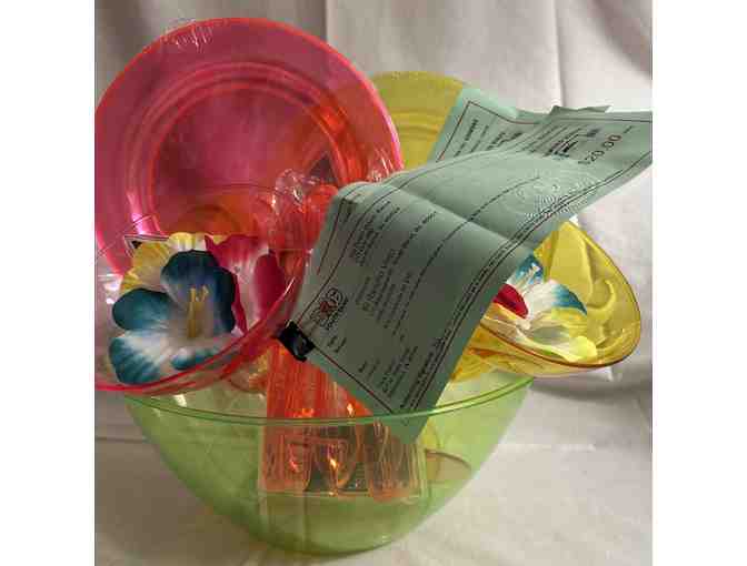 Plastic ware for snacks and margaritas and two $20 gift cards to El Rancho Viejo, Mishawaka