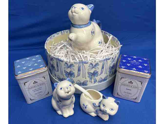 - Unused, authentic vintage Himark Taiwan Cat themed tea set featuring a beautiful white and blue floral cat shaped teapot, sugar dish with spoon, and creamer