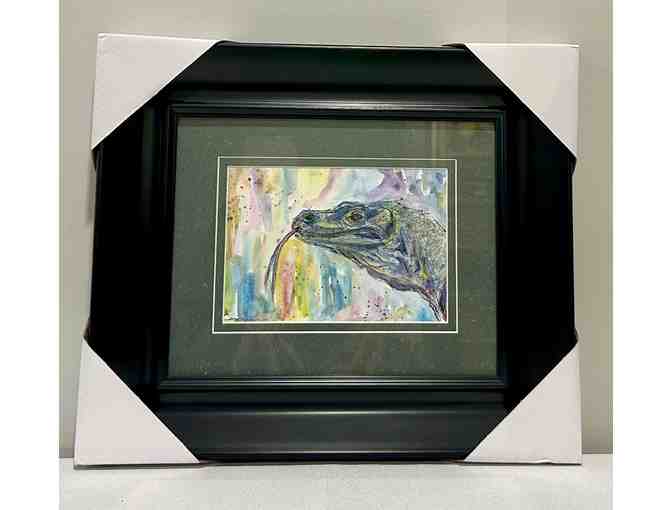 The Komodo dragon featured in this lovely work of art is a beautful ink and rainbow of watercolors on archival paper. The artwork measures 4 1/2" x 6 1/2" with a double dark green textured mat and surrounded by a 2 1/2" wide black frame. The total size of this piece is 11 1/2" x 13 1/2".