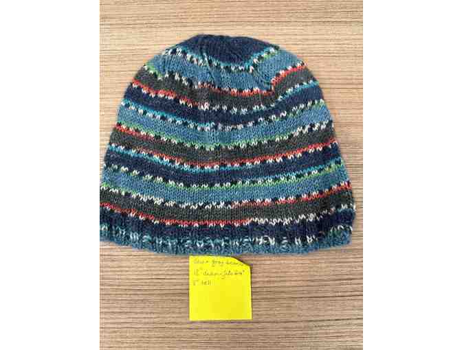 This listing is for a handmade knitted blue and gray beanie. Created by Deepa Balasubramanian. Measures 18 inches in diameter (fits up to 24") and 8 inches tall.