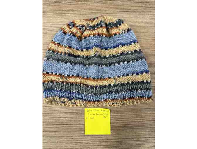 This listing is for a handmade knitted tan and blue beanie. Created by Deepa Balasubramanian. Measures 17" in diameter (fits up to 24") and 8" tall.
