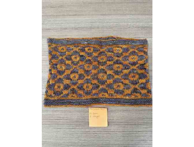 Beautiful handmade knit floriculture cowl. Measures 24" in diamter and 8" wide. Created by Deepa Balasubramanian.