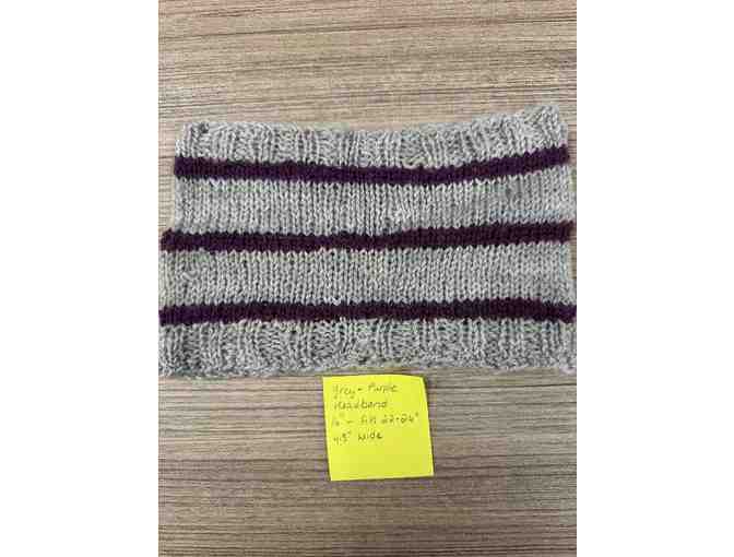 Handmade knit grey and purple headband measuring 16" in diameter (fits 22-24") and 4.5" wide. Created by Deepa Balasubramanian.