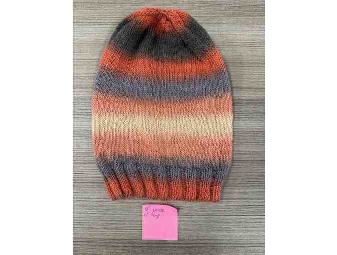 This knit hat measures 8" wide and 11" long. Handmade by Deepa Balasubramanian.
