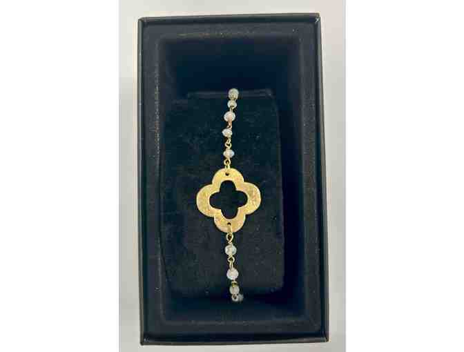 This handcrafted moonstone clover bracelet complements with every outfit. Made with 14-Karat gold filled wire wrapped moonstone beads and 14-karat gold over brass clover with a spring ring clasp.