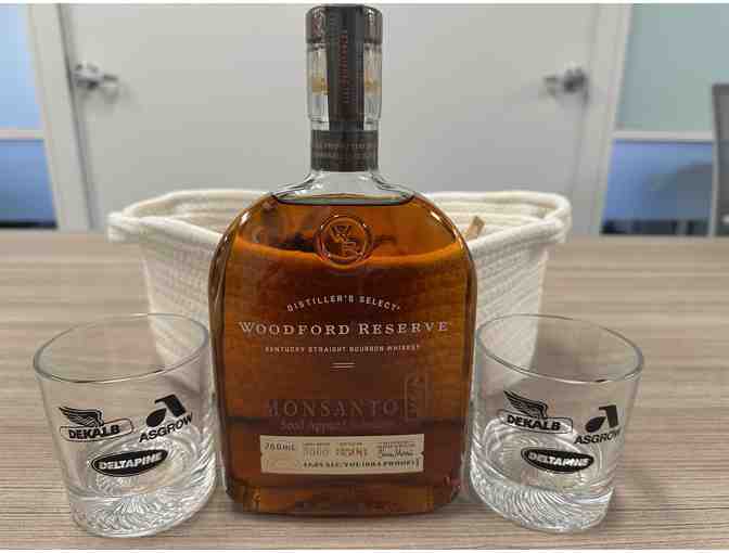 This basket contains one 750-ml bottle of Woodford Reserve Kentucky Straight Bourbon Whiskey and two logo'd glasses.