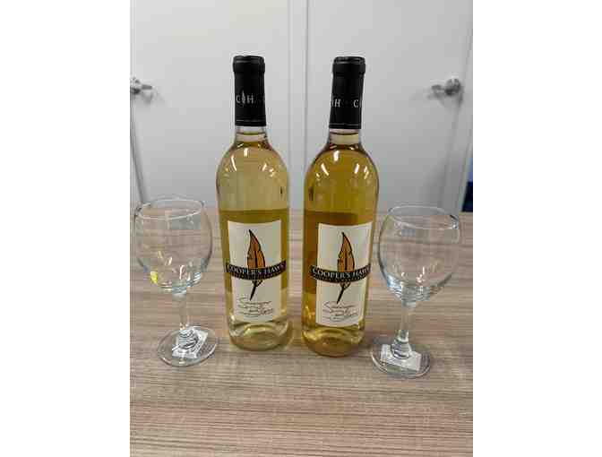 Two bottles of Cooper's Hawk sauvignon blanc and two wine glasses.