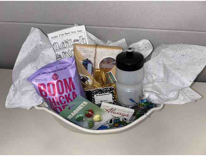 Includes: A book, snack, many stickers, a water bottle, magnets, a coaster, a highlighter, and book tabs.