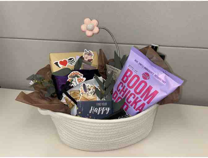 Includes: A book, snack, many stickers, a water bottle, a book light, a coaster, a highlighter, and book tabs.