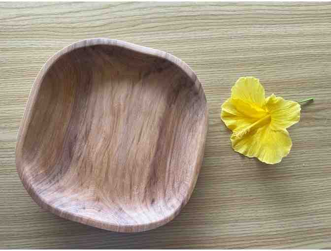 This item is a beautiful platter created from Primavera wood by local craftsman Mark Hubbard. Primavera wood is obtained from Gold Trees, which are shower tree members of the Cassia family and are native to Central America and Mexico. This particular wood was gathered from a tree in Waimea, on Kauai's westside. Primavera wood displays some of the deep, inner glow of mahogany and is sometimes referred to as "White Mahogany", though the trees are unrelated. The light and dark sections of the beautifully patterned wood are quite symmetrical in this piece and the images give an indication of the smooth, sensual texture of the finish.