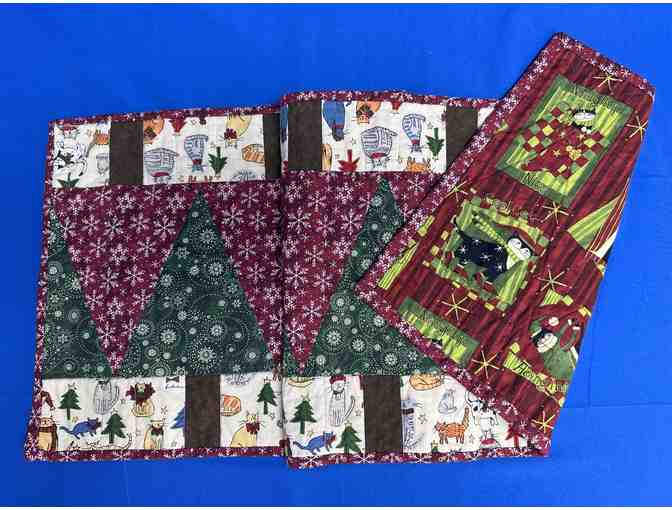 This hand-made quilted table runner combines two favorite themes, cats and Christmas! Extremely versitile, the runner is reversible and washable. The front showcases cats under christmas trees, and the back continues the theme with festive red and green kitties.