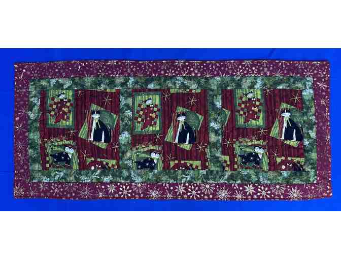 The Christmas season will shine brighter with this holiday themed reversible, hand-made quilted table runner. Playful tuxedo kitties dressed up and ready to enjoy the holidays. The reverse side is a red truck Christmas theme.