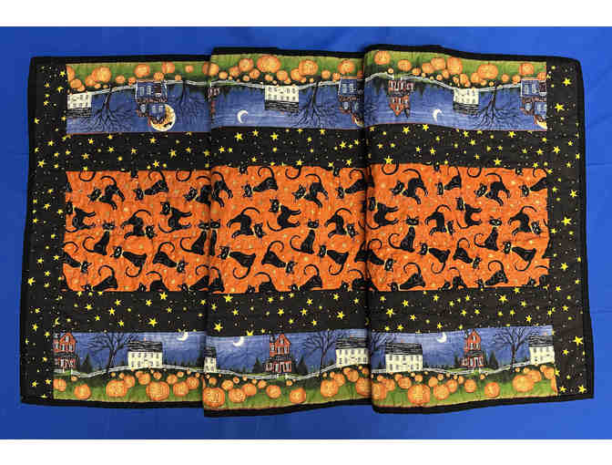 Celebrate two holidays with this hand-made quilted table runner. On the front panel are black cats and pumpkins to celebrate Halloween and the reverse side changes to deer and christmas trees.