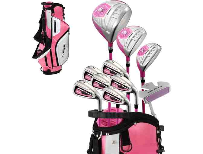 Precise M5 Women’s Golf Club Set – Includes a titanium driver, stainless steel fairway wood, hybrid, 5–PW irons, putter, stand bag, and 3 headcovers. Designed for right-handed women, this stylish pink set balances performance and playability.