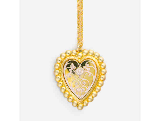Gold-plated heart necklace, decorated with white filigree. Made by Vossasylv in Norway. The necklace has an 18" chain. The heart is 1 1/2" long and 1 1/4" wide.
