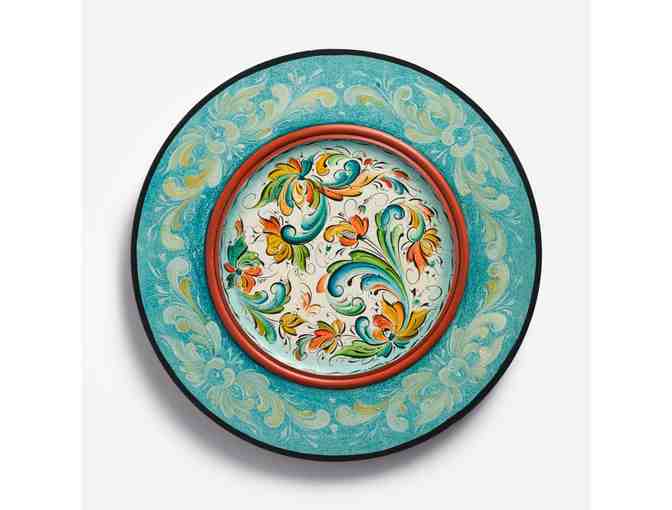 14" single bead wooden plate is handpainted with an original transparent Telemark design by Vesterheim Gold Medalist Lise Lorentzen.